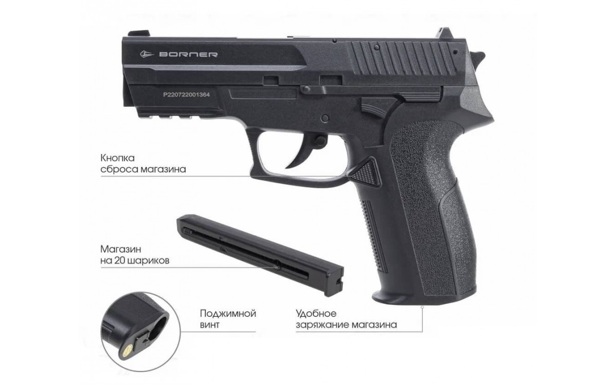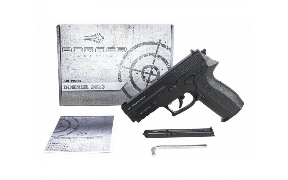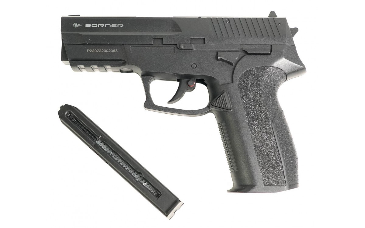 Пневматика Borner представлена на отечественном рынке с 2011 года и известна достойным качеством исполнения и привлекательными ценами. Продукция марки используется в основном для обучения основам владения оружием и развлекательной стрельбы, а широкий ассортимент компании может быть интересен даже опытным владельцам. Недавно в катологе фирмы появилась пневматическая реплика австрийского пистолета Sig Sauer SP2022.