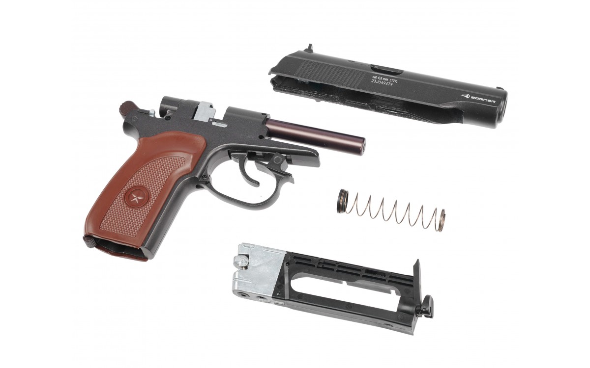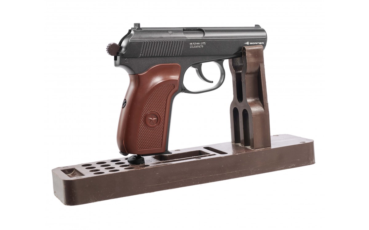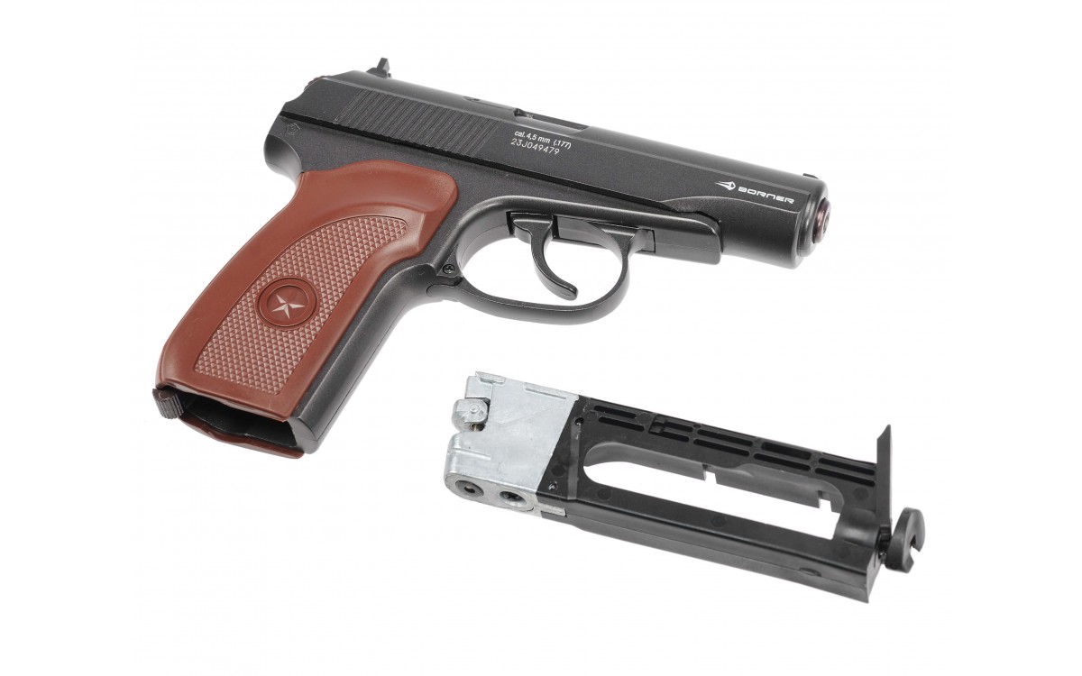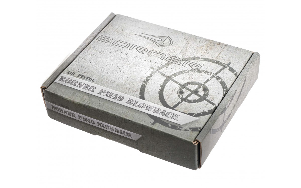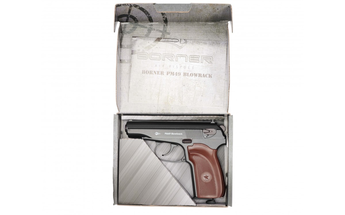 Один из многих аналогов легендарного пистолета Макарова от российской компании Borner. В отличие от Borner PM 49 эта версия имеет функцию Blowback. Т.е. при стрельбе затвор будет двигаться и имитировать отдачу как из огнестрельного оружия. На данный момент в России и Беларуси нет аналогов Макарова с этой функцией, что делает его иногда даже более привлекательным для покупателей, чем пневматический ПМ выполненный на том же заводе, на котором делают боевой - МР-654К-20.