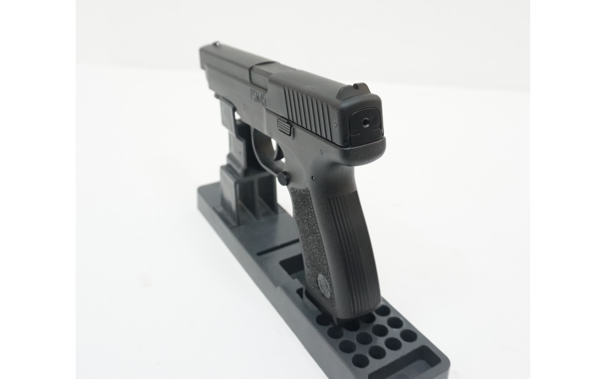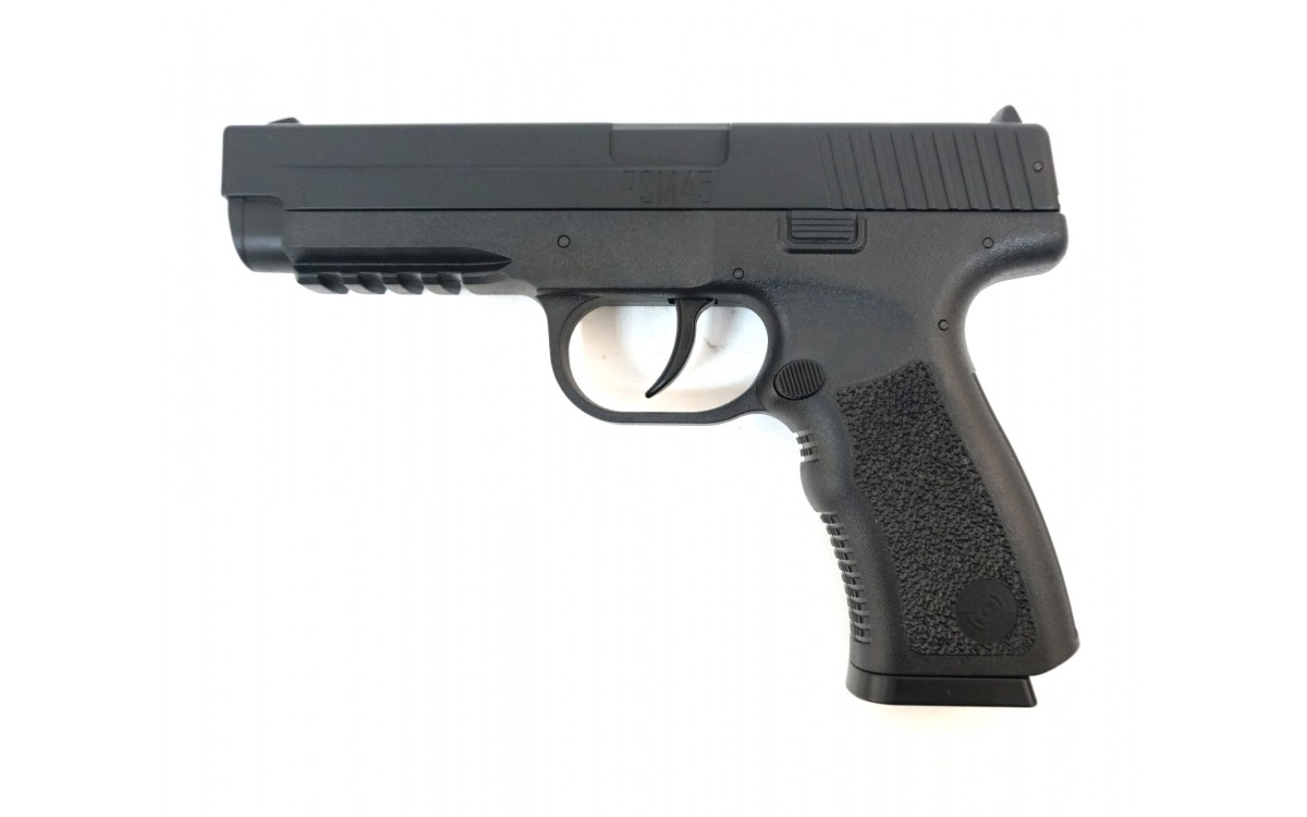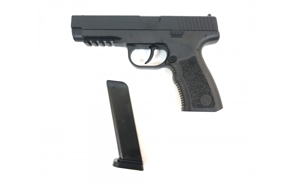 Пневматический пистолет Crosman PSM 45 имеет рамку, изготовленную из ударопрочного полимера. Из функциональных деталей он включает в себя подствольный вивер для дополнительного снаряжения и кнопку сброса магазина с левой стороны. Шероховатое покрытие рукоятки и выемки для пальцев создают все условия для нескользящего хвата.