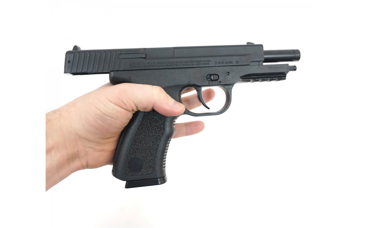 Пистолет Crossman создан под влиянием наиболее распространенного полицейского пистолета Glock 17. Это отражено в форме затвора и угле наклона магазина. В то же время он отличается уникальными решениями, повышающими комфорт пользователя.