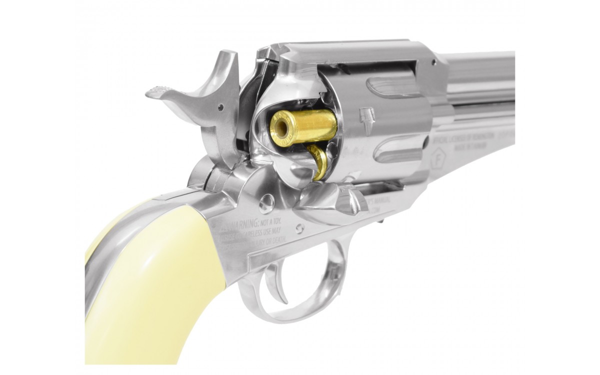 Боеприпасами для данного револьвера могут служить патроны калибра 4,5 мм, а также шарики того же калибра. Для этого в комплекте поставляется по 6 патронов для каждого типа пуль, соответствующим образом промаркированных на нижней стороне. Боеприпасы вставляются в барабан с правой стороны, поднимается предохранительная скоба, поворачивается соответствующий механизм барабана и боеприпасы вставляются в паз. Пистолет Crossman Remington может быть заряжен до 6 патронов и стреляет в полуавтоматическом режиме, что делает его удобным в использовании без необходимости нажимать на курок после каждого выстрела.