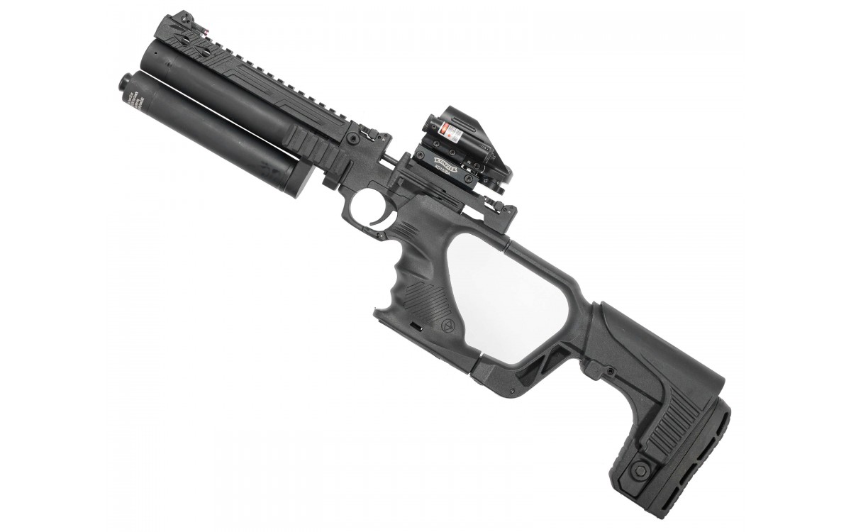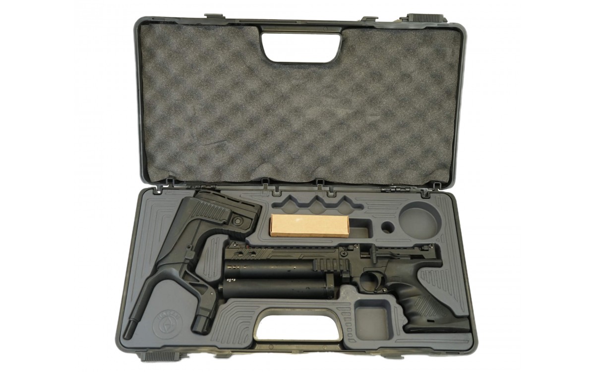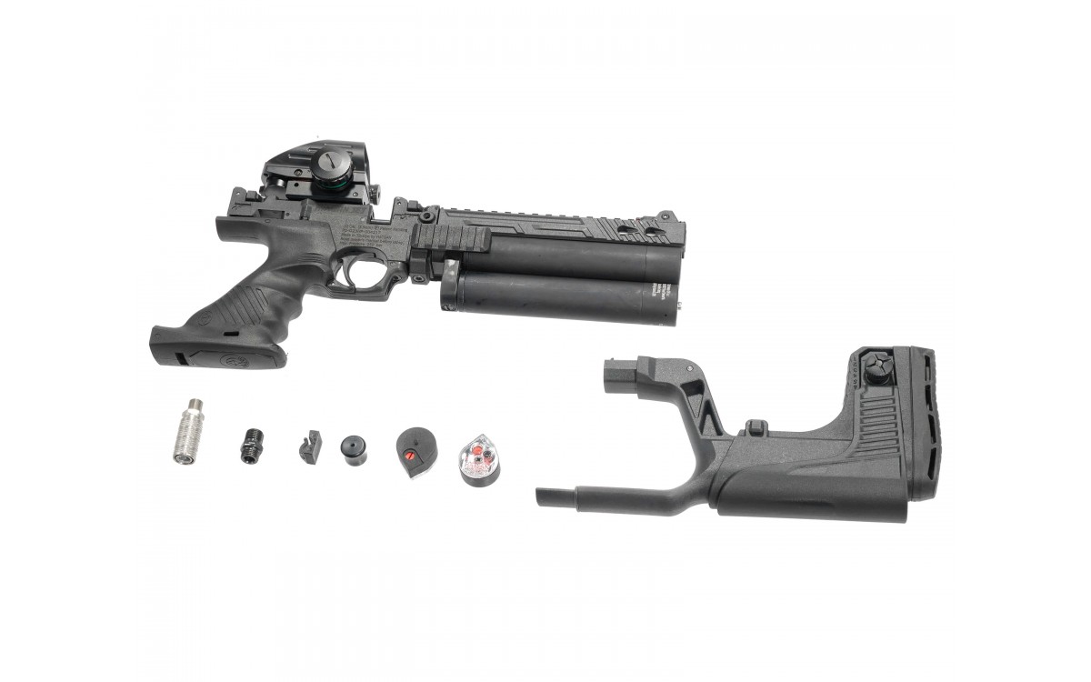 Комплектация изделия позволяет пользователю в нужный момент трансформировать пистолет в полноценный укороченный карабин. Для этого необходимо установить съемный приклад, подобрать его размеры в соответствии с антропометрическими параметрами и установить прицел. Модель имеет три прицельных приспособления, передний и задний прицелы могут складываться или откидываться по желанию заказчика.