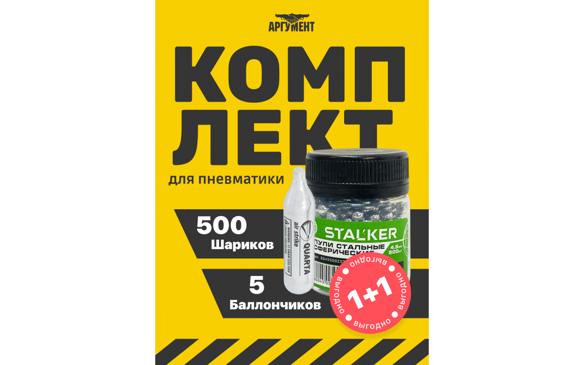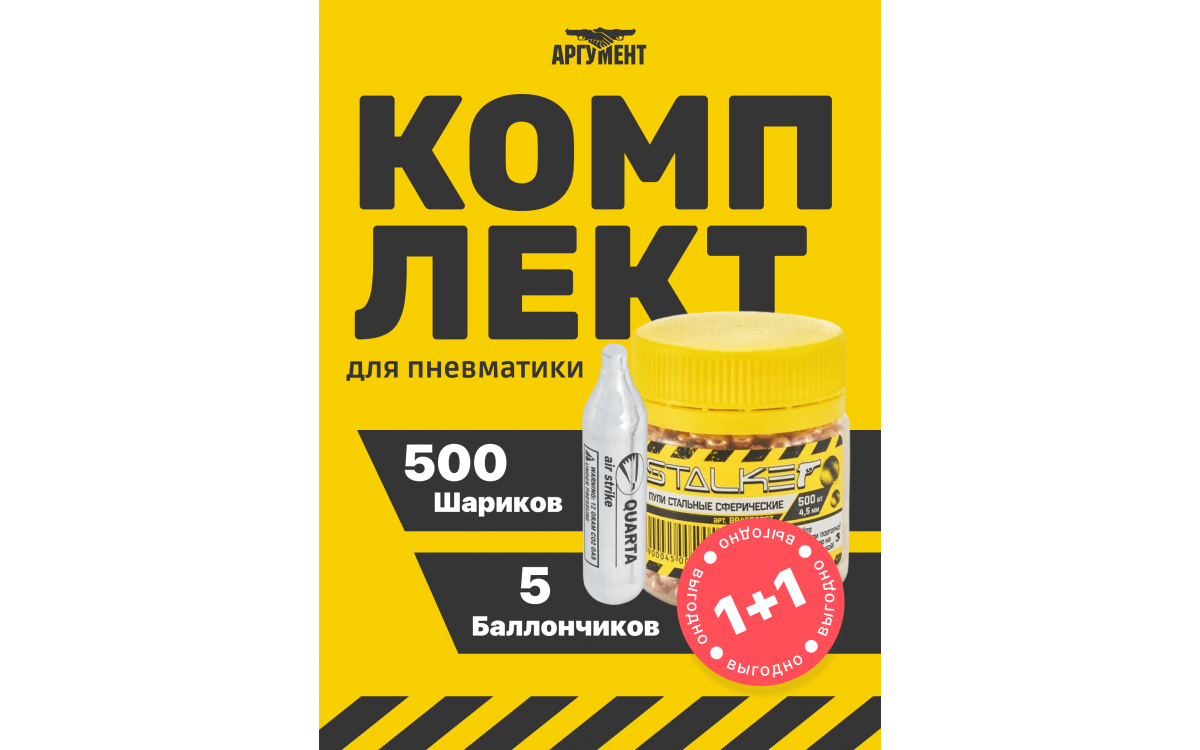 Комплект состоит из 5 баллончиков CO2 и баночки шариков на 500 штук для пневматических пистолетов и винтовок калибра 4,5 мм. Баллончики можно использовать и для других калибров, если это предусмотрено конструкцией пневмата.