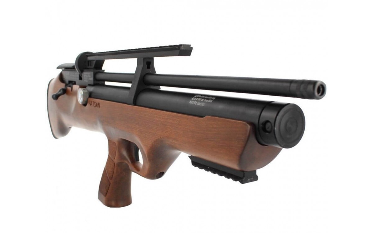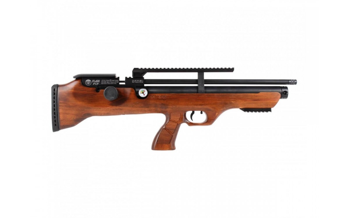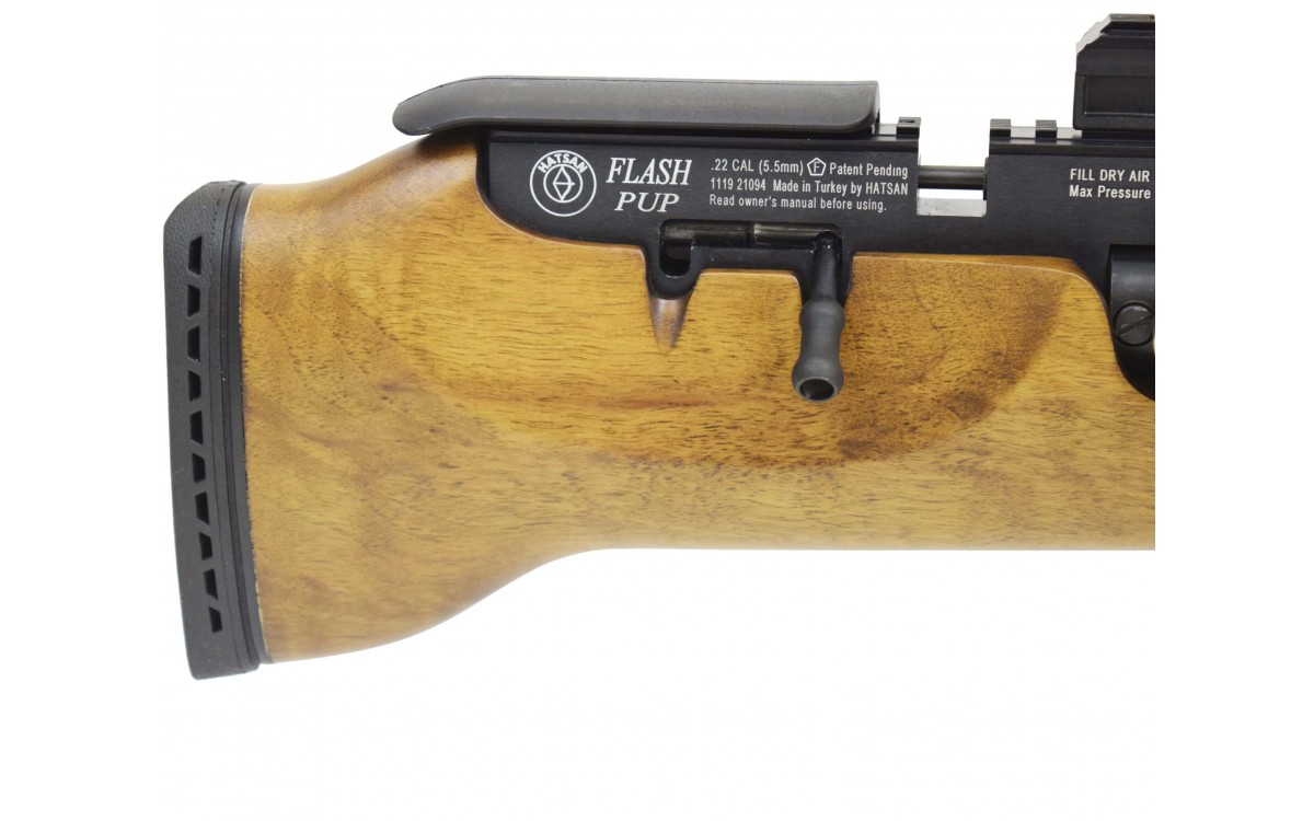 Hatsan FLASHPUP - пневматическая винтовка, относящаяся к классу PCP пневматики, основное отличие которой - компоновка Булл-пап. Корпус Булл-пап позволяет активно передвигаться с винтовкой на значительные расстояния, что обеспечивается длиной винтовки всего в 645 мм и весом в 2,73 кг.