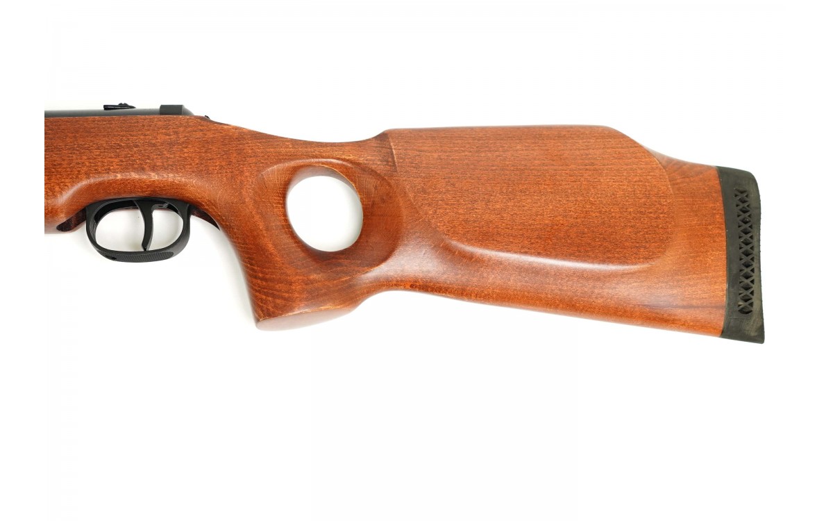 Для комфортного использования оружия производитель предлагает эргономичную рукоятку с ортопедическими отверстиями для большого пальца, а наличие шероховатой поверхности на цевье пневматической винтовки исключает скольжение оружия даже при работе во влажной среде. Изделие имеет прорезиненную подложку, которая поглощает импульс отдачи при выстреле и уменьшает степень подбрасывания ствола.