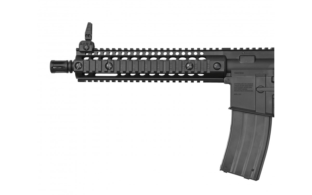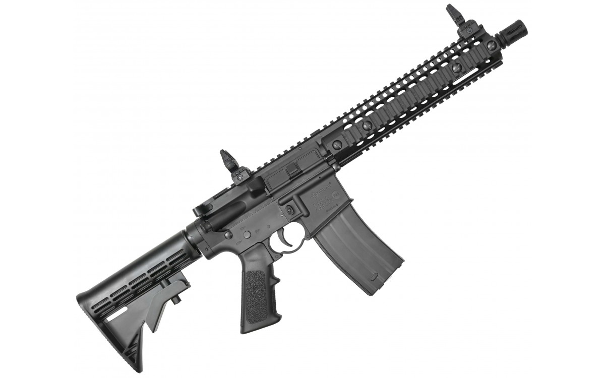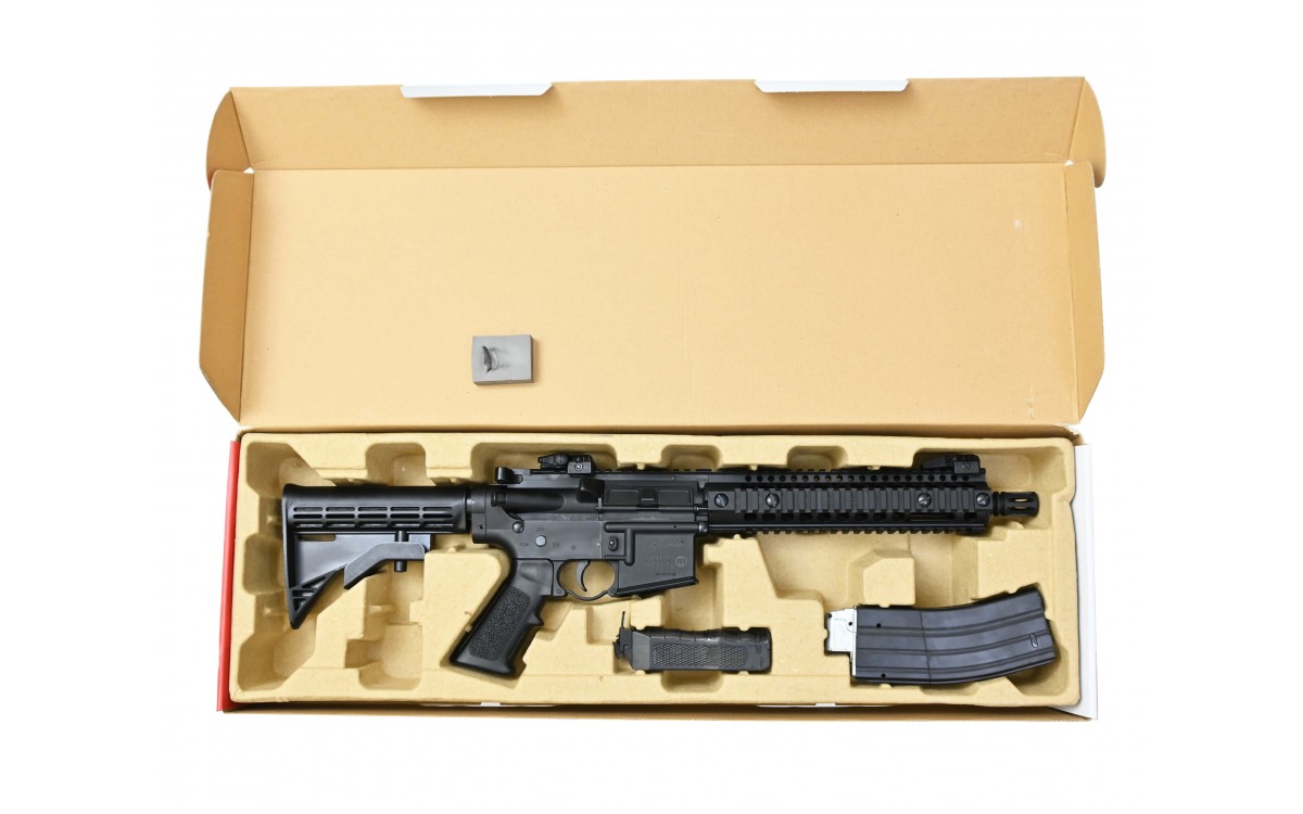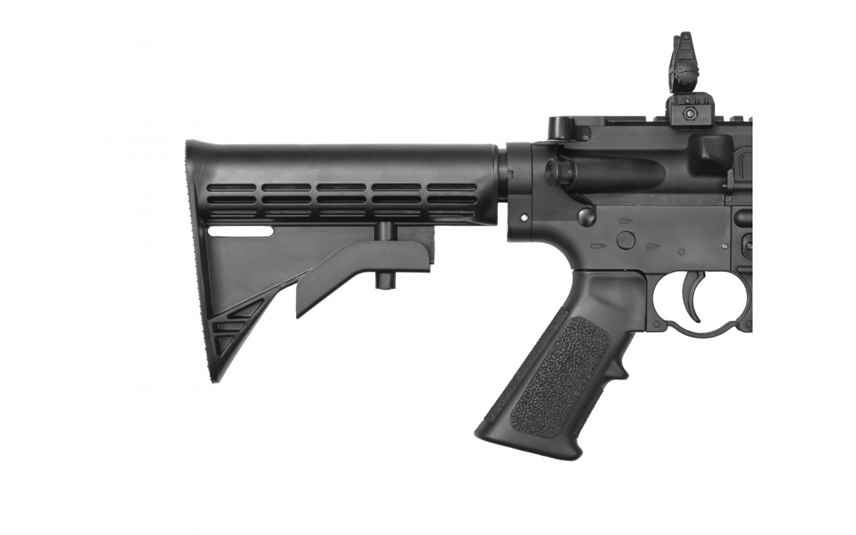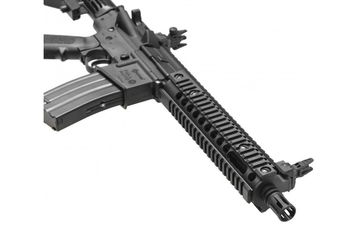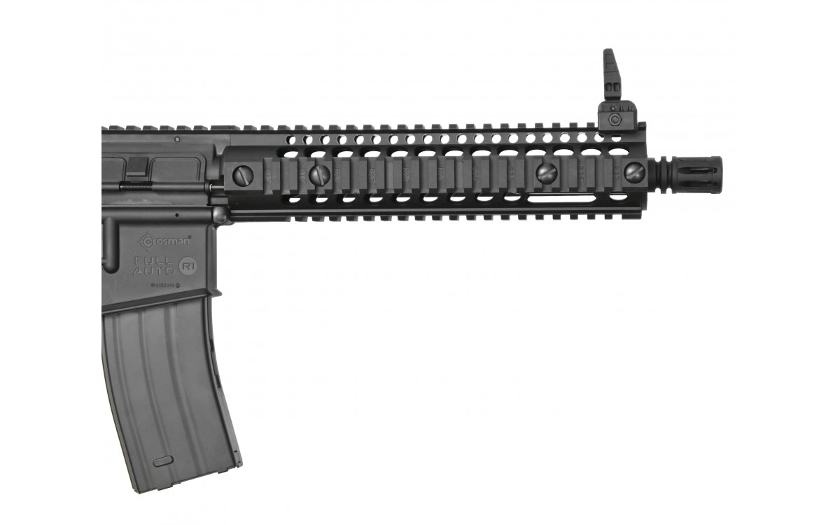 Представленная пневматическая AR-15 оснащена цевьём типа Quad Rail выполненным из высокотехнологичного нейлонового волокна. Эта деталь взаимозаменяема с оригиналом, на ней размещена планка Пикатинни и отверстия K-mod, чтобы монтировать на ней любое доступное для оригинала оборудование от фонарика до сложной оптики. Откидные мушка и целик позволяют поражать цели, если дополнительных прицельных приспособлений не установлено.