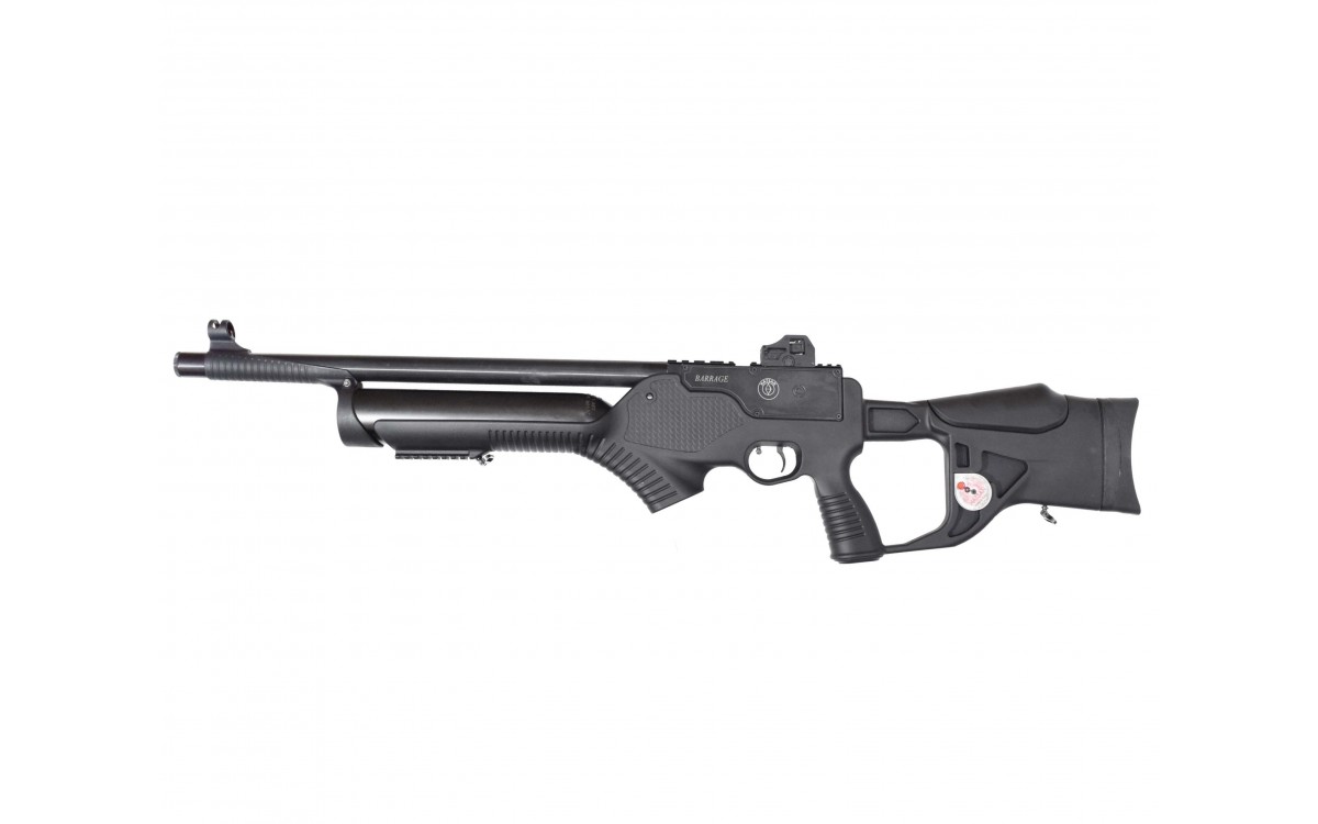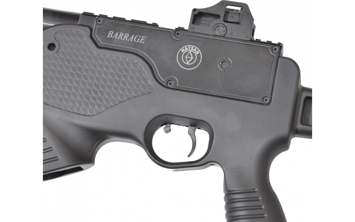 Винтовка Hatsan Barrage отличается установкой запатентованной системы, которая защищает оружие от потери сжатого воздуха в случае удара о твердый предмет. Винтовка заряжается сбоку, а режим стрельбы полуавтоматический.