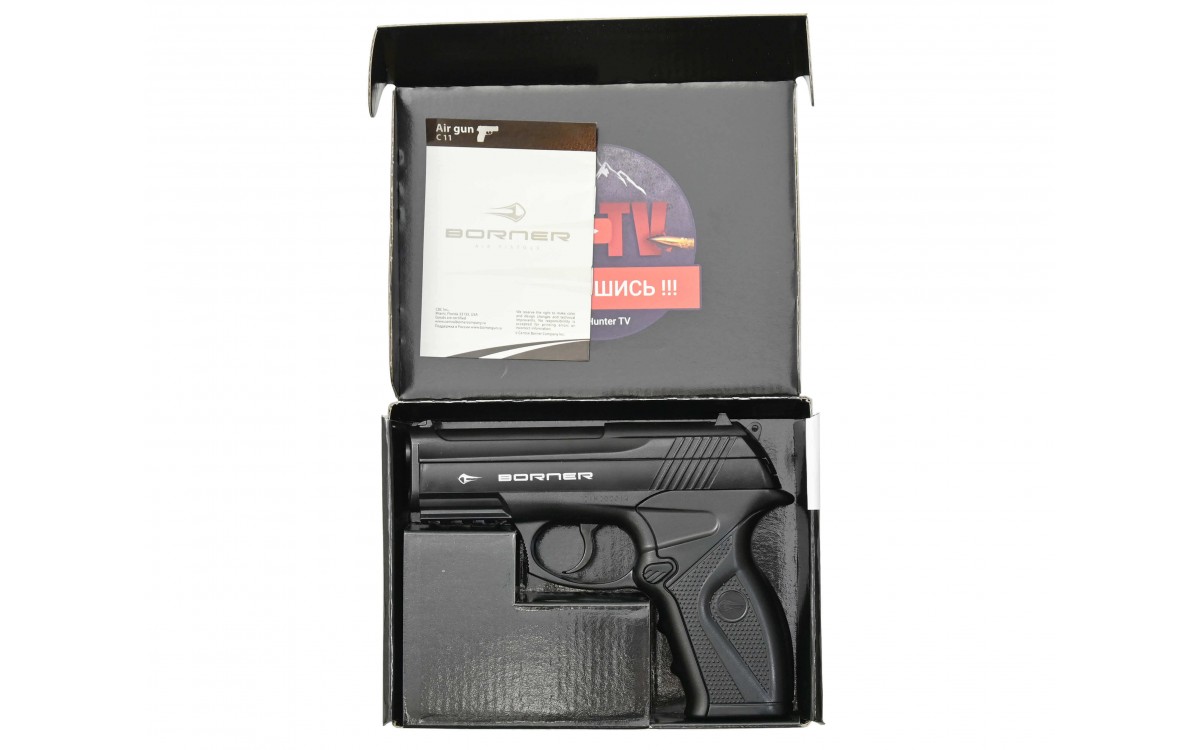 Интересной моделью в мире пневматических пистолетов является пока мало известный Borner C11. Поставки в Россию этой модели начались в конце 2011 г. Пистолет Борнер С11 входит в группу бюджетного оружия, но это нисколько не умаляет его качества. Пневматический механизм модели ориентирован на непривередливого потребителя, который хочет иметь точное, надежное и мощное оружие без дополнительных параметров. Серьезная убойная сила пистолета проявляется на незначительных расстояниях. Технические характеристики данной модели отлично сочетаются со стильным дизайном внешнего вида.