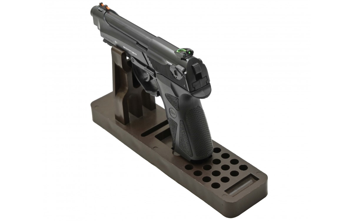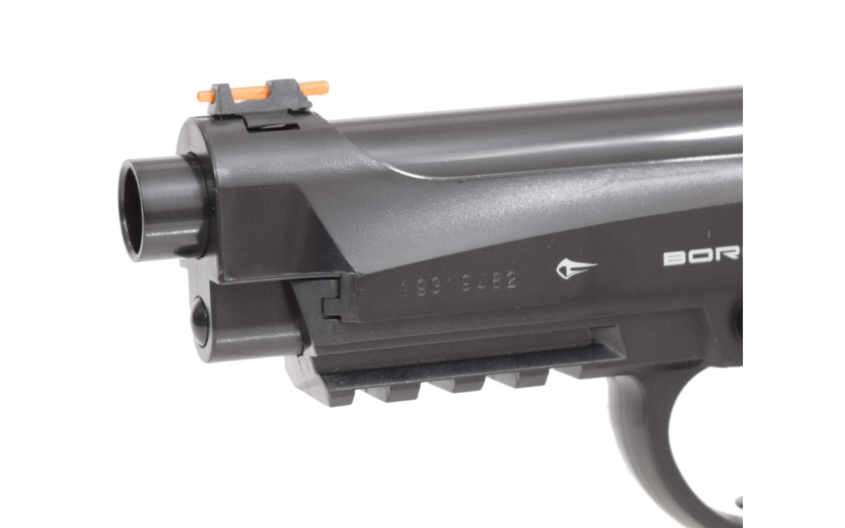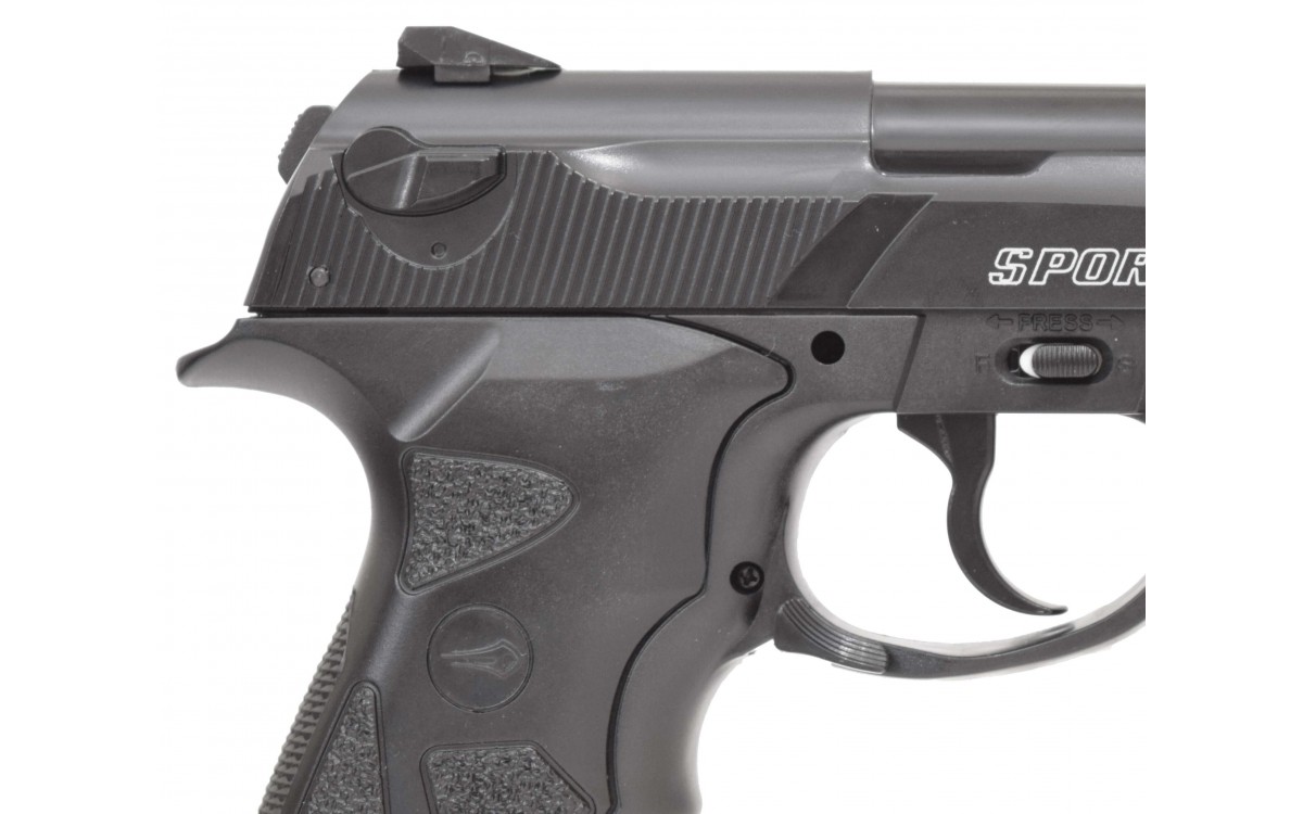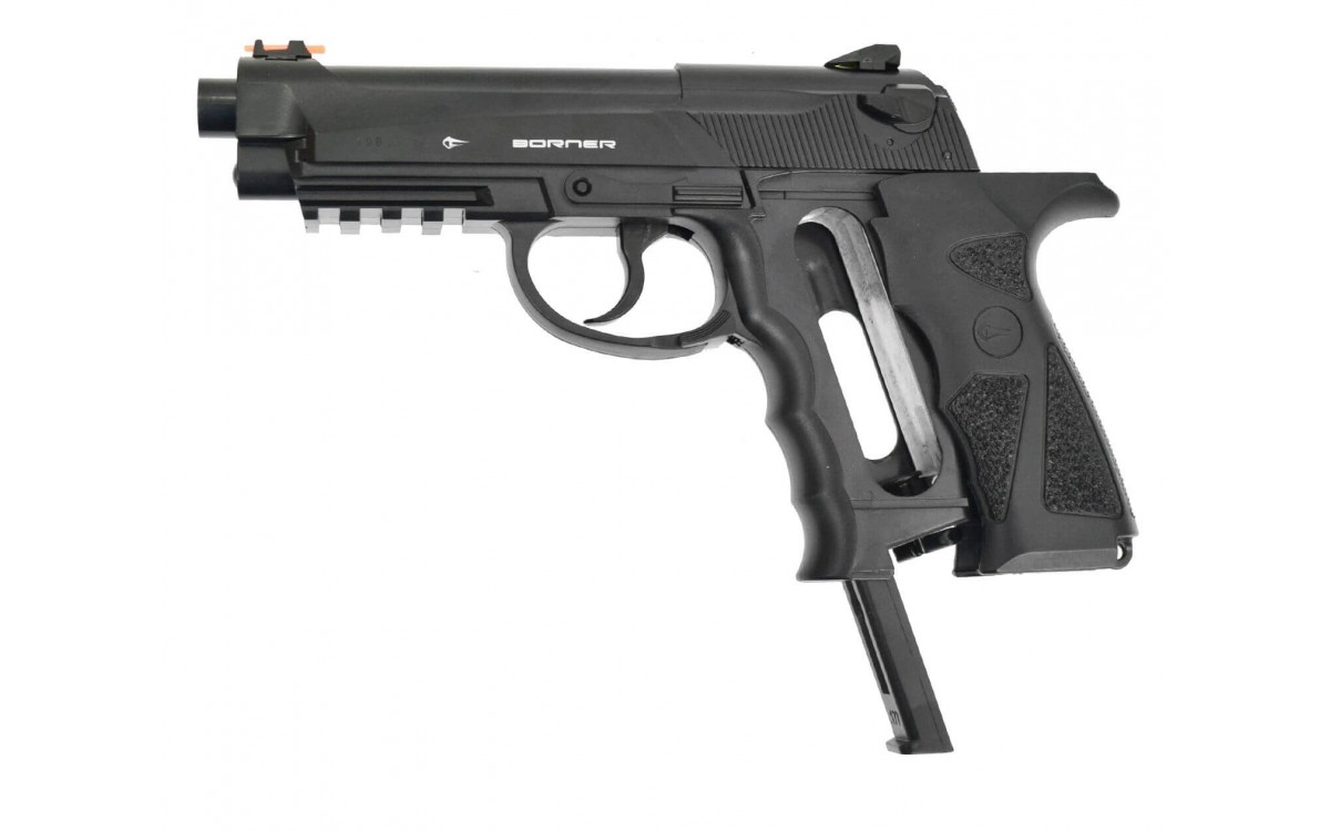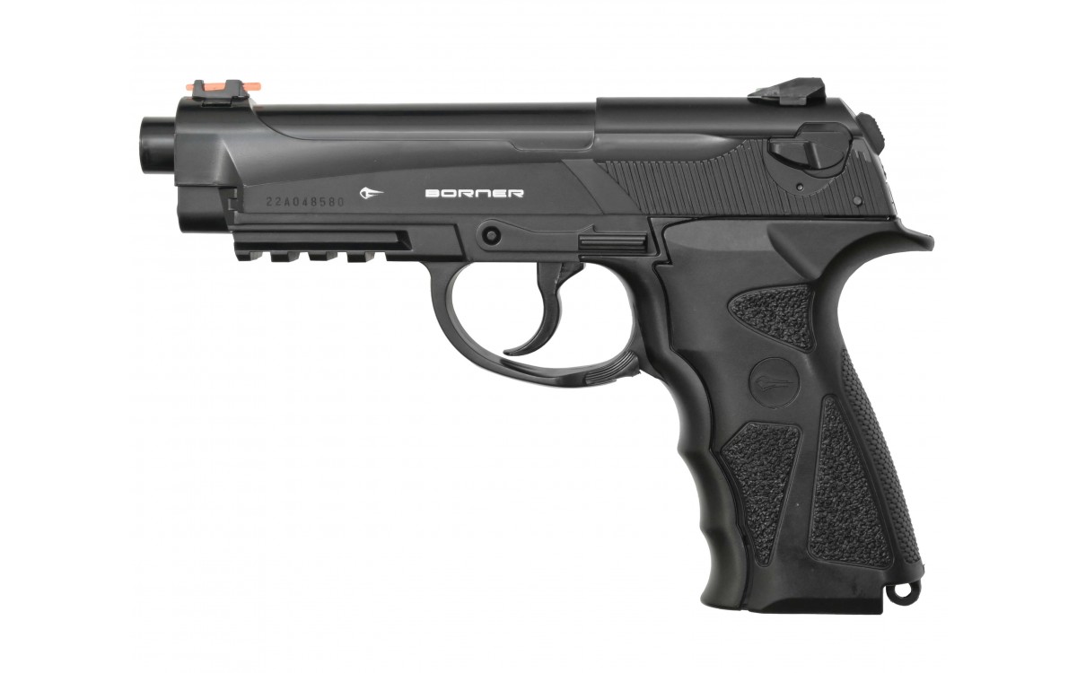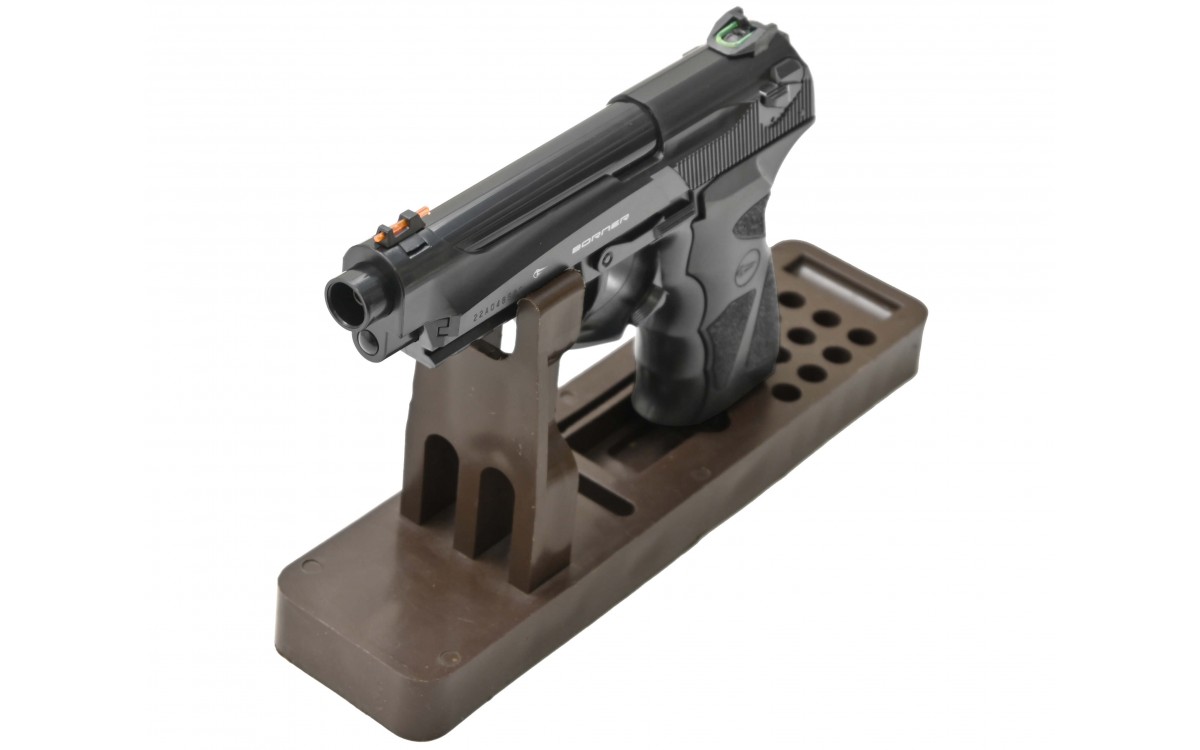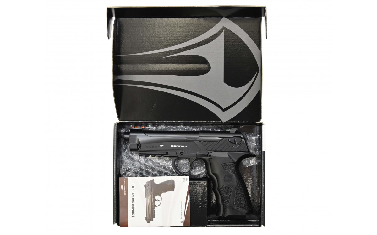 Пневматический пистолет Borner Sport 306 – бюджетная модель для начинающих стрелков. Он изготовлен из пластика и весит всего 450 гр. На прицеле и мушке пистолета расположены светоотражающие нити. На правой стороне рамки Borner Sport 306 находится предохранитель. Активация предохранителя приводит к разъединению спускового крючка и ударно-спускового механизма, нажатие не производит выстрела. Неподвижный затвор не мешает возможности разбирать конструкцию. Давление в область спускового крючка приводит к отодвиганию стволика. После этого происходит удар по клапану, после чего порция газа выпускается в ствол оружия. Пневматический пистолет Борнер Спорт 306 работает только на самовзводе. Местом установки баллончика с углекислым газом является рукоятка, а крепление происходит при помощи поджимного винта. Максимальная скорость полета составляет 120 м в сек. Оптимальное расстояние до мишени – 15-20 м.