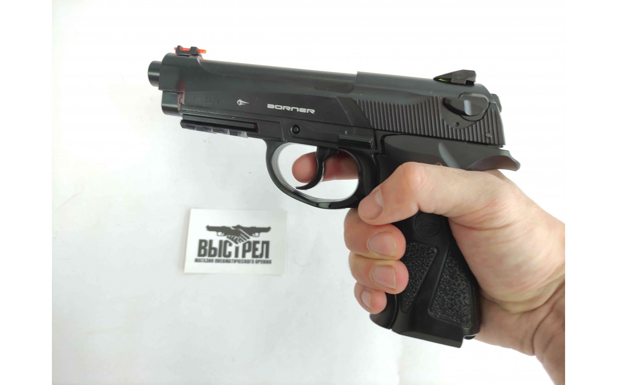 Модификацией пневматического пистолета Borner Sport 306 является модель Borner Sport 306m. Для изготовления ее корпуса используется высокопрочный сплав металлов, что обеспечивает ощутимую массу изделия - 950 гр. Приятная тяжесть в ладони не может не радовать ценителей оружия. Цвет матового покрытия Borner Sport 306 (m) - черный, на передней части рукоятки есть специальные выемки для пальцев стрелка. Пистолет Borner Sport 306 (m) оснащен системой подвижного ствола. Выстрел происходит после самовзвода, модель может похвастаться длинным и легким ходом своего спускового крючка.