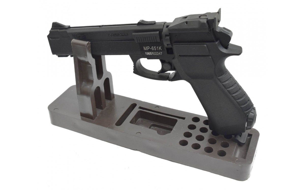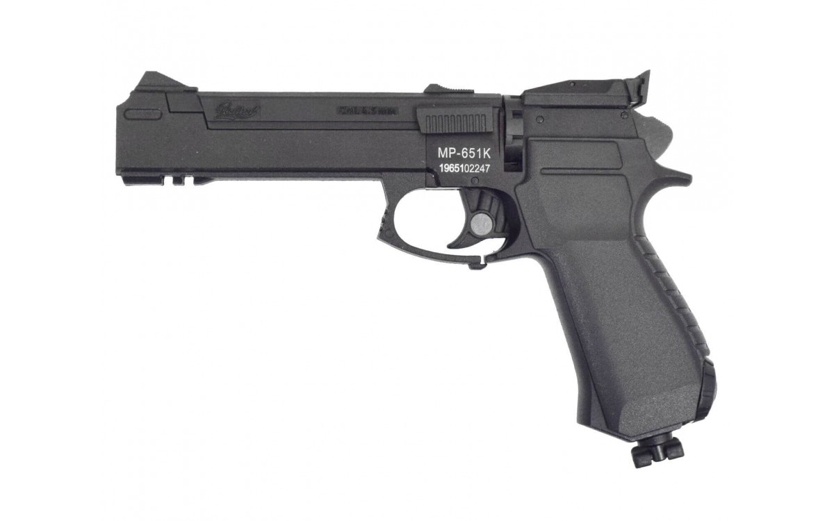 - Пистолет МР-651-09 К относится к газобаллонному пневматическому оружию. Источником энергии служит баллончик 12 гр. СО2. Скорость вылета пули достигает 120 м в сек.