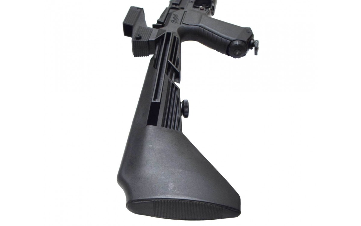 - Корпус пистолета изготовлен из металлического сплава, ручка и ложе – из высококачественного пластика. Несмотря на облегченный корпус, весит изделие 1,5 кг, так что приклад здесь является скорее необходимостью, нежели эффектным аксессуаром.