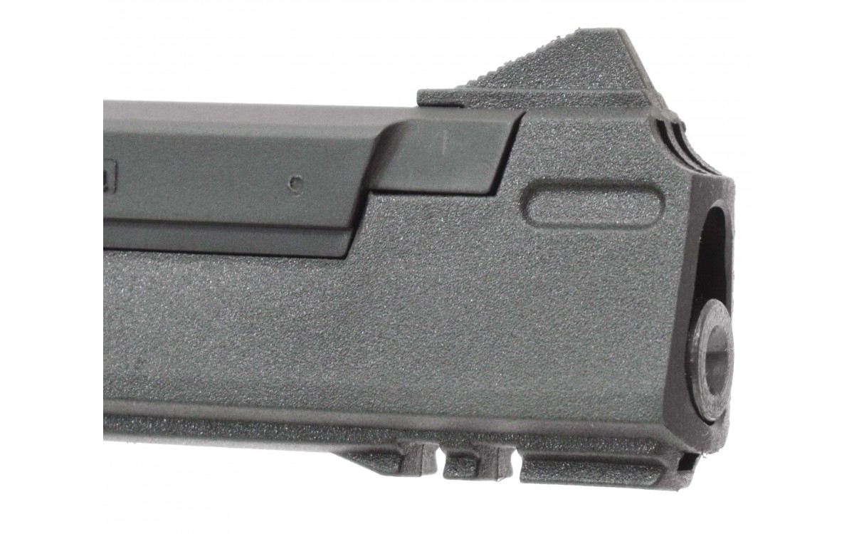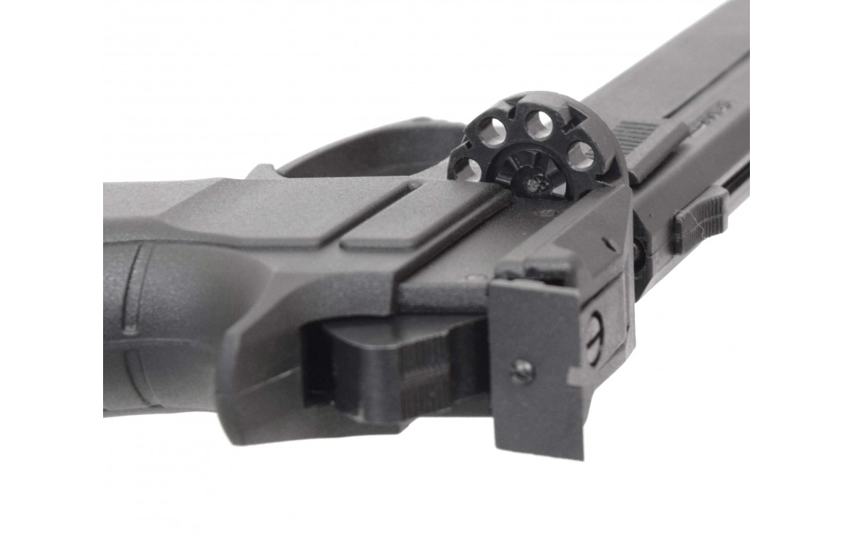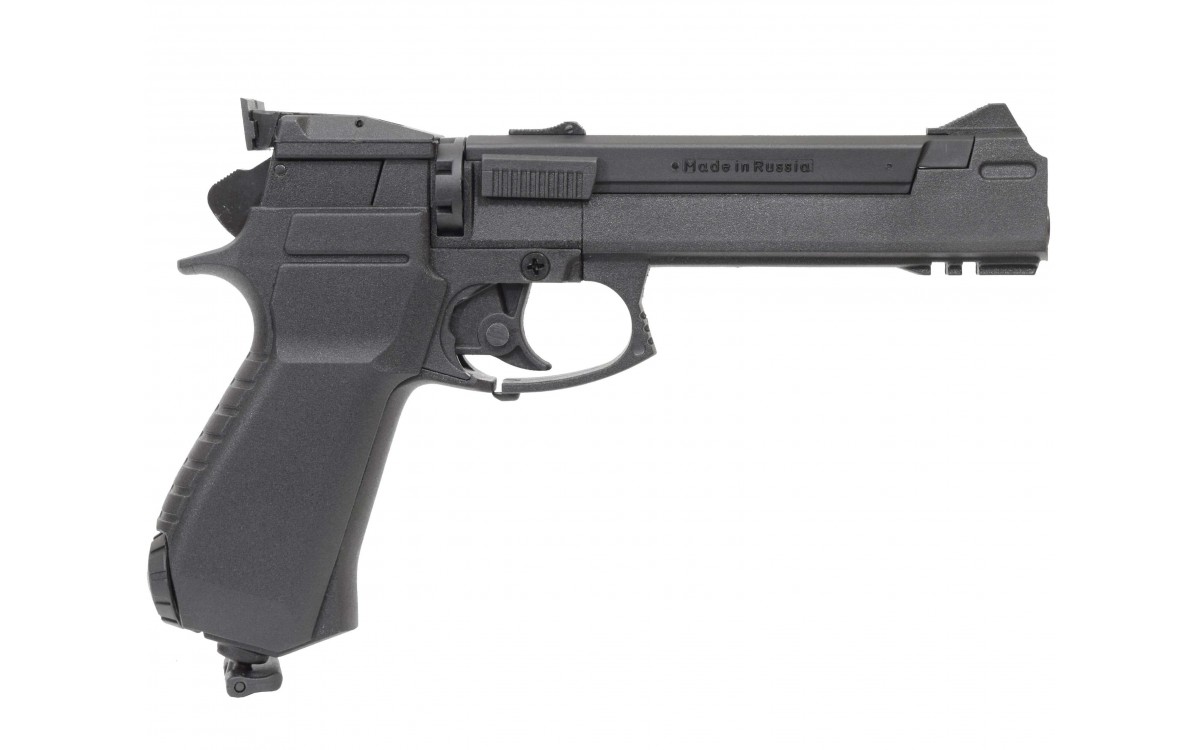 - Одной из главных особенностей этой модели является наличие нарезного ствола, из которого можно стрелять как пулями, так и шариками калибра 4,5 мм.