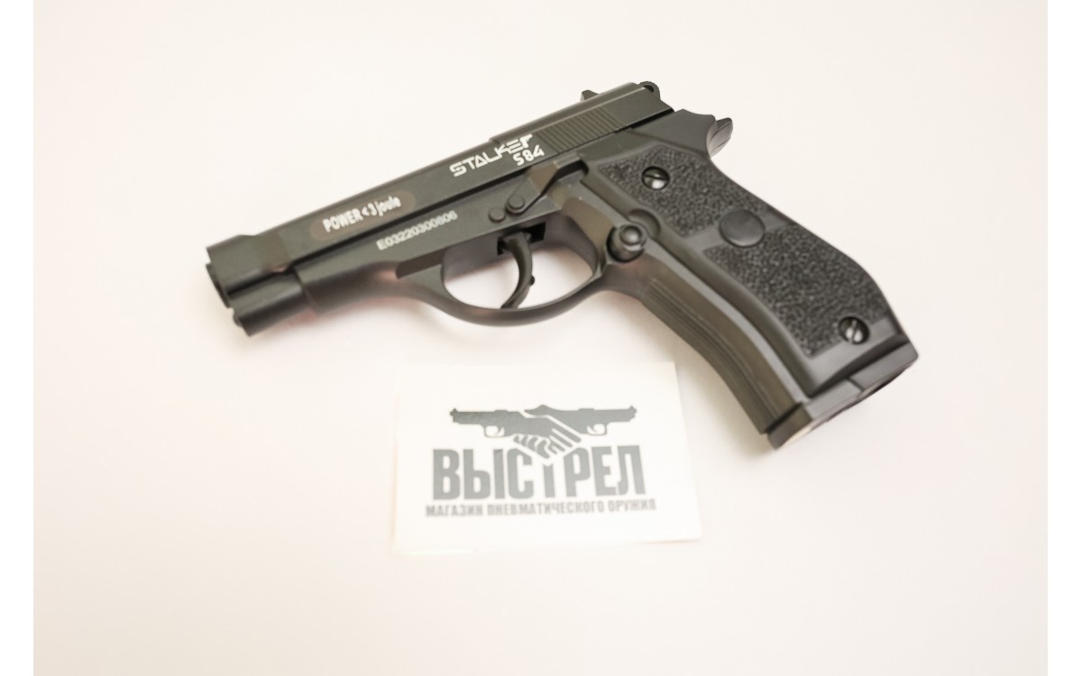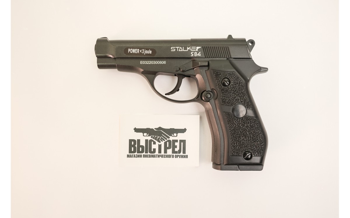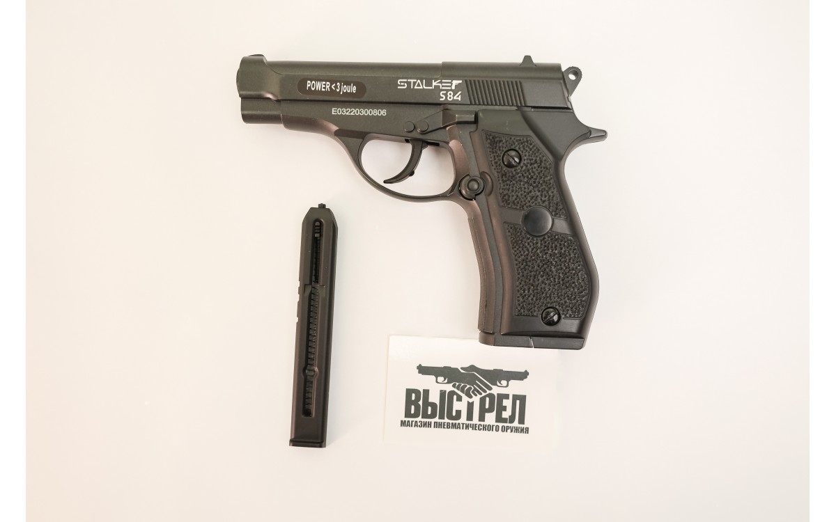 Stalker S84 является пневматическим пистолетом - аналогом классической Беретты 84. Сходство с данной моделью с внешней стороны, а также и по ощущениям при его держании в руке. Изделие комфортно держать и рука не устает даже если вы производите стрельбу длительное время. Произведен в Китае на заводе Cyma. Пистолет обладает великолепной кучностью и меткостью при стрельбе, а в опытных руках тем более покажет прекрасные результаты.