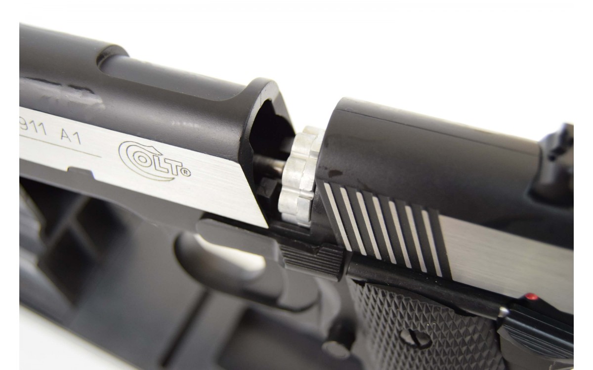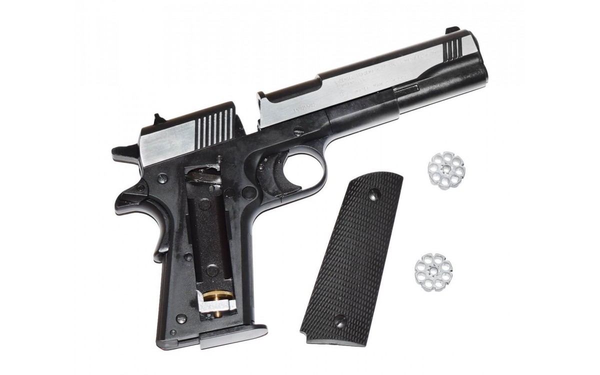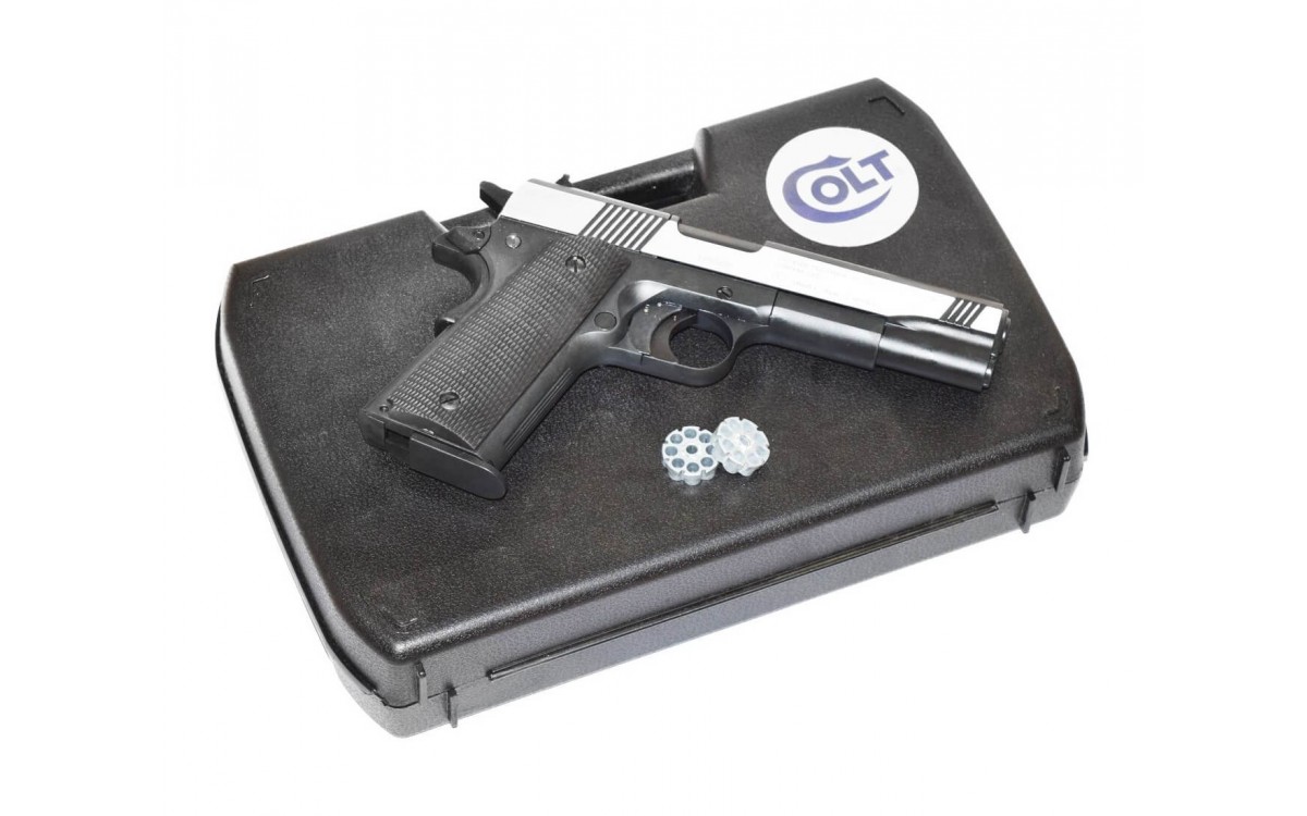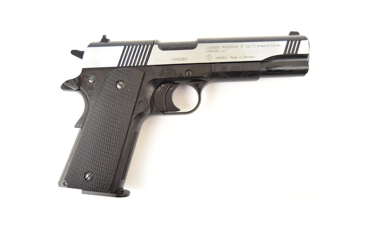- Umarex Colt Government - пистолет, оснащенный стальным нарезным стволом, что означает, что в качестве снарядов, используемых для стрельбы, выступают свинцовые пули калибра 4,5 мм; магазин барабанного типа вмещает 8 пуль;