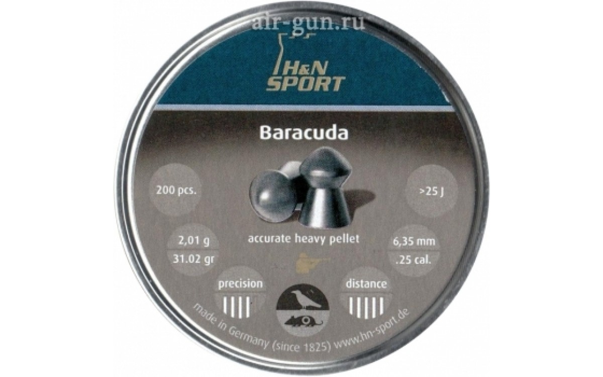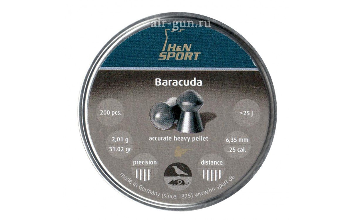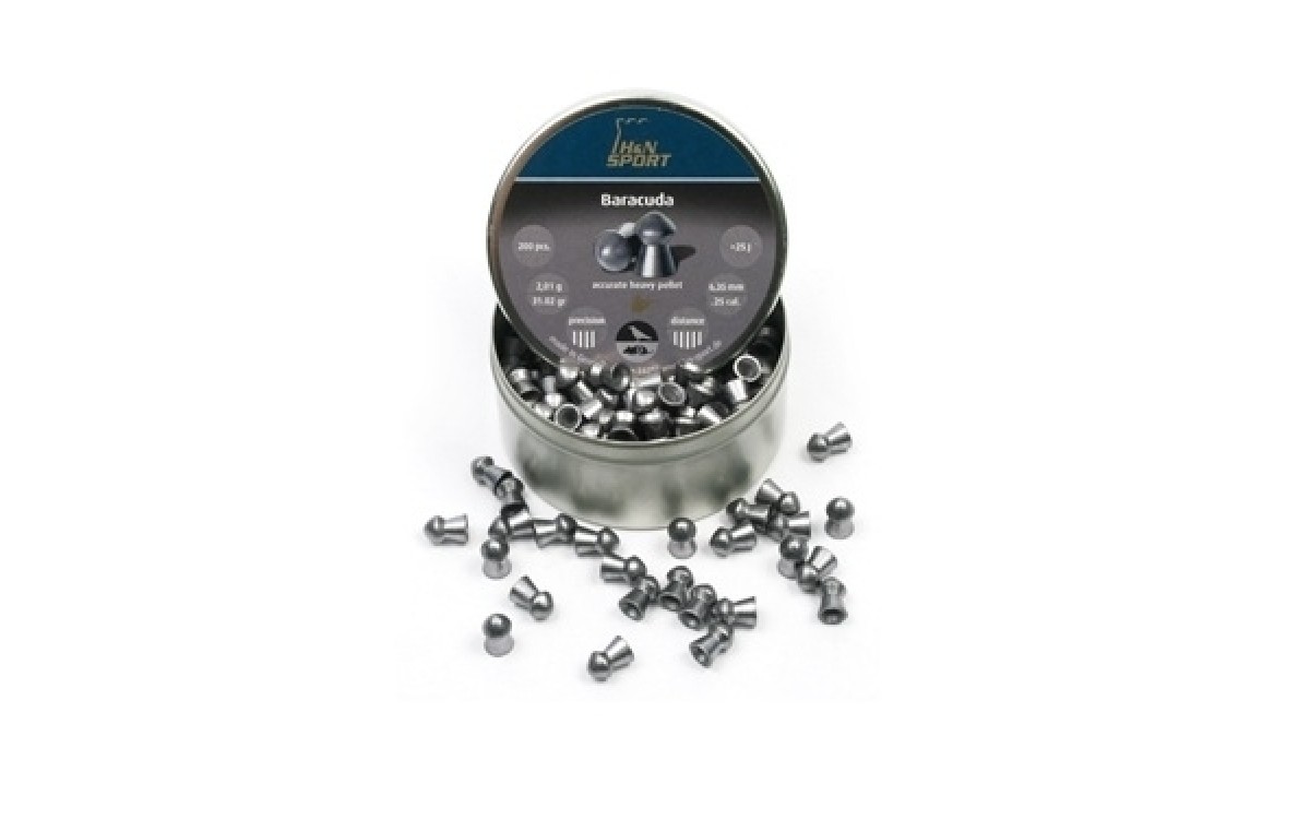 Пульки к пневматике 6.35 мм H&N Baracuda (калибр .25), (вес – 2.01г) банка 200 шт - это тяжелая, очень точная пуля для дальних дистанций. Первоклассный аэродинамический дизайн для высокой пробиваемости и проникающей способности. Высокая кучность. Минимальное освинцовывание и равномерное распределение попаданий благодаря специальному сплаву и смазке. Поверхность гладкая. Абсолютная точность пуль фирмы H&N для пневматического оружия - гарант вашего успеха. Пули отличаются высокой кучностью и четкими краями пробоин. Специалный сплав пуль H&N гарантирует минимальное освицовывание, что является значительным и ценным преимуществом. Во время стрельбы помимо точности важны также проникающая способность и деформационные характеристики. Пули H&N отвечают даже самым высоким требованиям заядлых охотников. Они представляют собой идеальное сочетание точности и целевого воздействия — и это при отличном соотношении цены и качества.