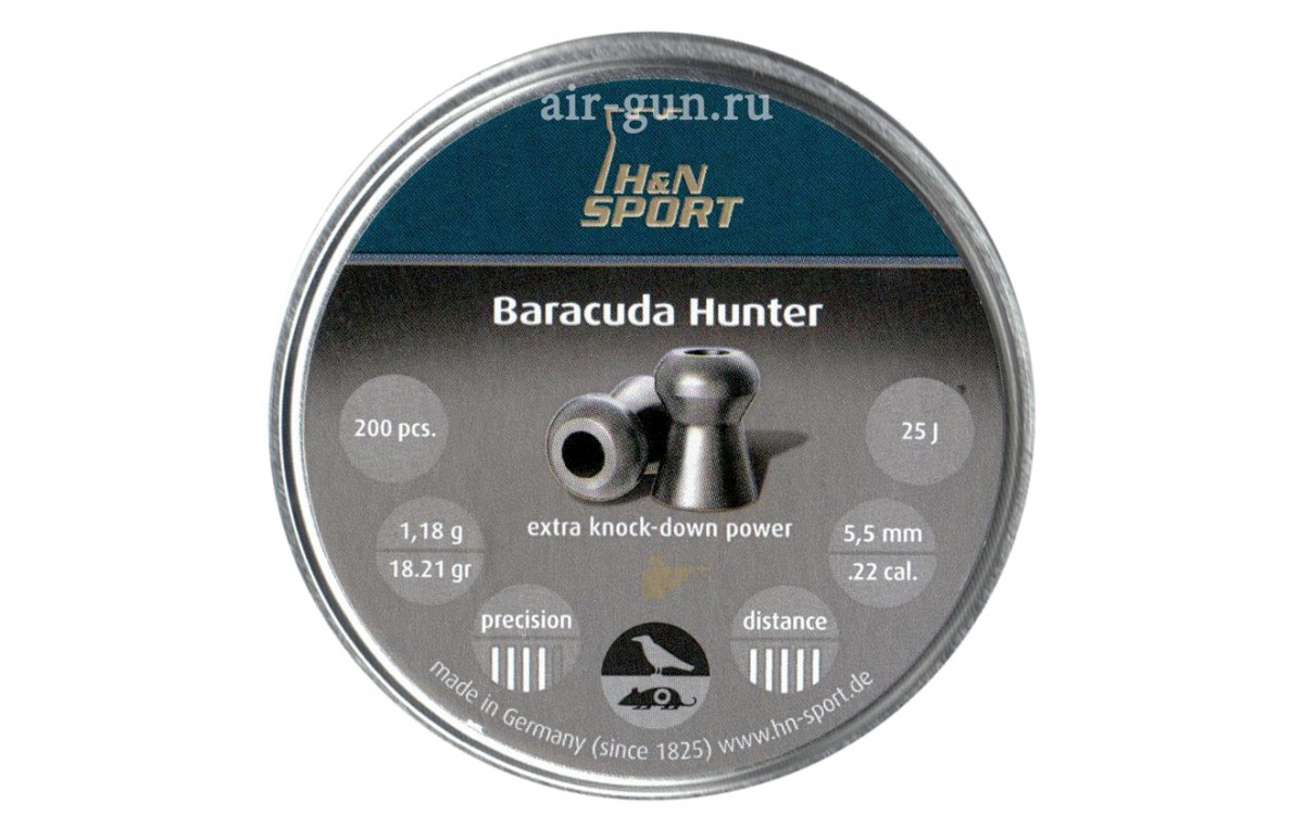 Пуля пневм. H&N Baracuda Hunter.22" 5,5 mm (вес 1,18 гр). Тяжелая, чрезвычайно точная охотничья пуля для дальних дистанций. Усовершенствованный дизайн Baracuda с наилучшими аэродинамическими характеристиками для максимальной пробиваемости, высокой проникающей способности и контролируемой деформации пули. Высокая кучность. Поверхность гладкая с глубокой выемкой в головной части.