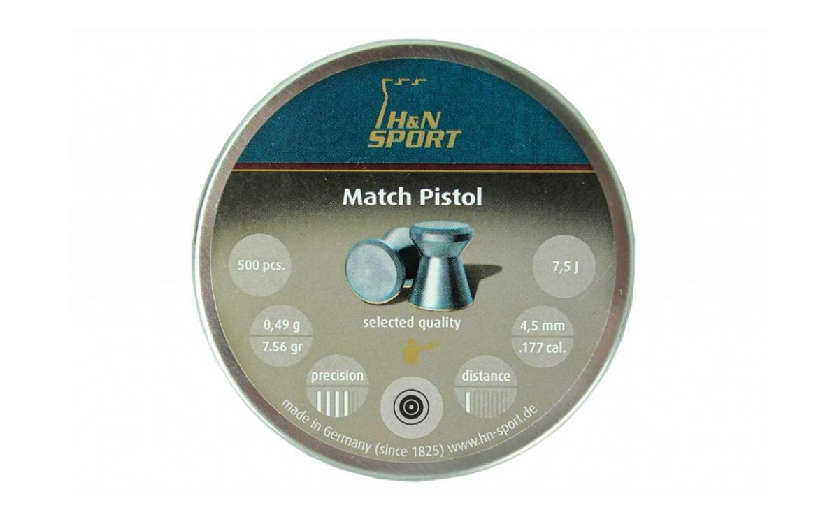 Пули пневматические H&N Match Pistol 4,5 мм 0,49 грамма (500 шт.) — свинцовые пули от компании H&N Sport. Высокоточная свинцовая пуля применяется для соревнований и тренировок. Четкие края пробоин, отличная кучность, превосходное соотношение цена-качество. Калибр 4,5 мм (.177). Диаметр 4,48 мм- 4,51мм. Масса пули 0,50 грамма. Масса пули 7,56 гранн.