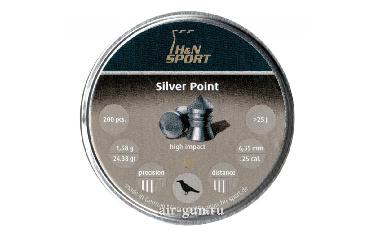 Silver Point - тяжелая, точная охотничья пуля для средних дистанций. Высокая пробиваемость и проникающая способность с наивысшим шоковым воздействием. Поверхность пули гладкая, с канавками, деформируются при проникновении в цель. Рекомендуется к использованию в пневматических винтовках с дульной энергией 16 – 50 Дж. Вес пули в калибре 6,35 мм – 1,58 грамма