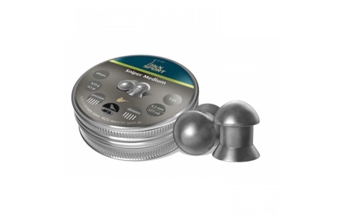 Пули пневматические H&N Sniper Medium 4,5 мм 0,55 грамма (500 шт.). Пуля Sniper Medium это бочкообразная высокоскоростная пуля для соревнований и для охоты. Она была разработана для Field Target и Hunter Field Target соревнований с пневматическими винтовками с дульной энергией 16 Дж (калибр 4,5мм) и более. Особая форма пули снижает сопротивление воздуха и обеспечивает настильную траекторию полёта. Калибр 4,5 мм. Вес пули 0,55 грамма (8,5 гран). Рекомендуемая дульная энергия 7,5 дж. В упаковке 500 шт.