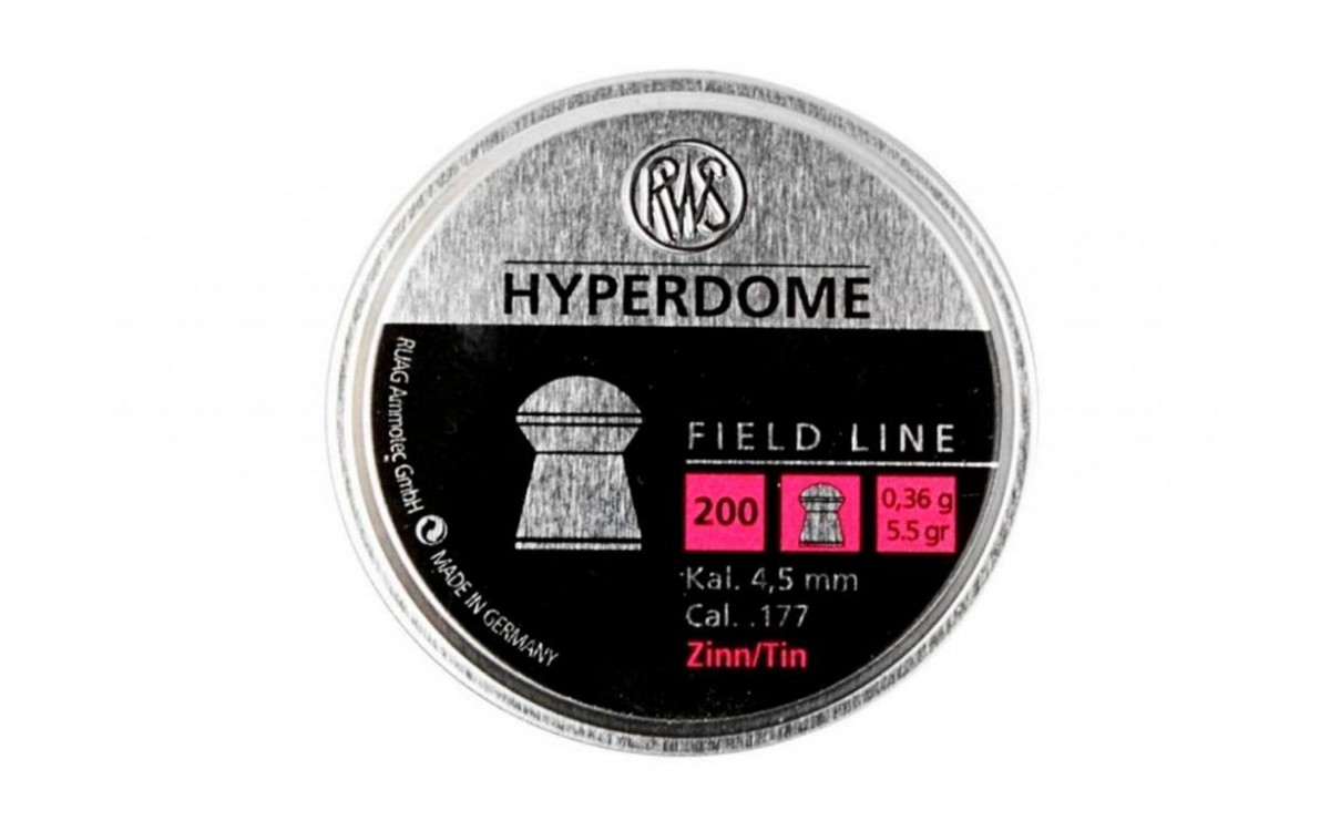 Пули пневматические RWS Hyperdome 4,5 мм 0,36 грамма (200 шт) - легкие пули с закругленной головной частью. Благодаря круглой головной части улучшена пробивная способность пули. Вес одной пули 0,36 гр. В упаковке 200 пуль калибра 4,5 мм. Пуля развивает высокую скорость благодаря небольшому весу. Пули изготовлены из легированного олова и не содержат свинца, что сказывается на чистоте ствола. Пули RWS Hyperdome отличает высокая кучность, скорость. Они идеально подходят для полевой стрельбы. Рекомендуемая минимальная дульная энергия от 7,5 J.