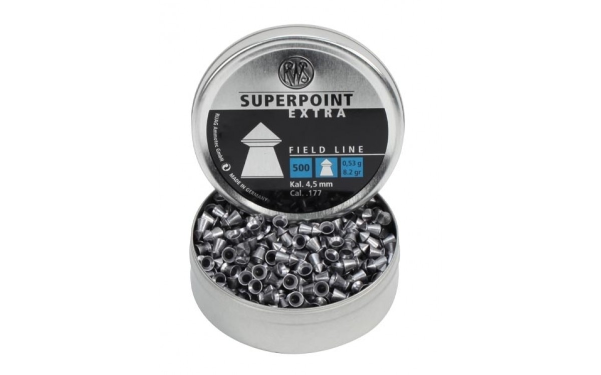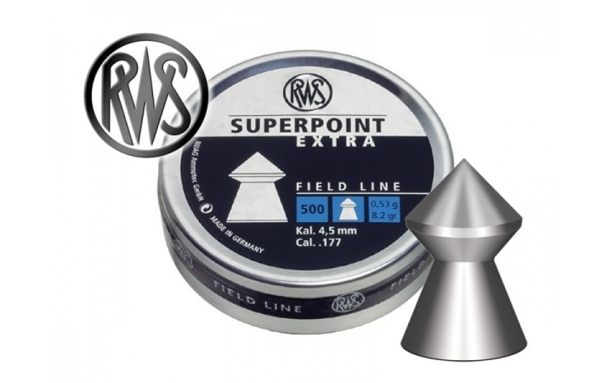 Свинцовые пневматические пули RWS Superpoint Extra калибра 4,5 мм массой 0,53 грамма (8,2 гран). Это пуля средней массы для стрельбы из пневматической винтовки. Имеет конусообразную головную часть, что обеспечивает высокую пробиваемость и проникающую способность. Данная пневматическая пуля RWS Superpoint Extra снискала большую популярность среди охотников. Оптимальное распределение массы изделия способствует высокой точности попадания.