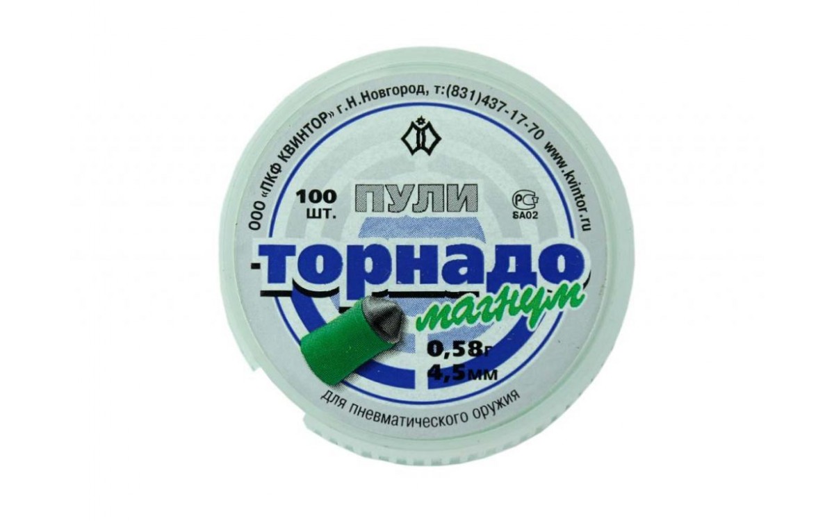 Пули пневматичесикие Торнадо-Магнум 4,5 мм 0,58 грамма (100 шт.) - металлопластиковая пуля для пневматики, состоящая из свинцовой головной части ожевальной формы, заходящей хвостовиком в пластиковую юбку. Смещенный вперед центр тяжести и обтюрация головной и хвостовой частей пули придают устойчивость в полете и, как результат, обеспечивают хорошую кучность. Характеристики пули Торнадо Магнум 0.58 : калибр 4,5 мм. вес 0,58 г. длина 8,7 мм. Производство: Квинтор