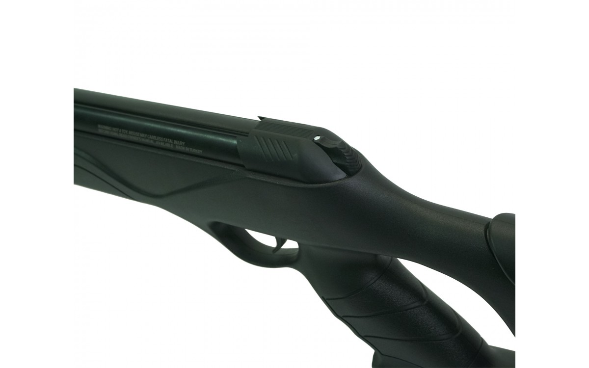 Корпус винтовки выполнен из металла, а ложа - из высококачественного черного пластика. Устройство износостойкое и при правильном уходе обеспечит владельцу долгий срок службы. Для снижения массы винтовки на прикладе имеются прорези.