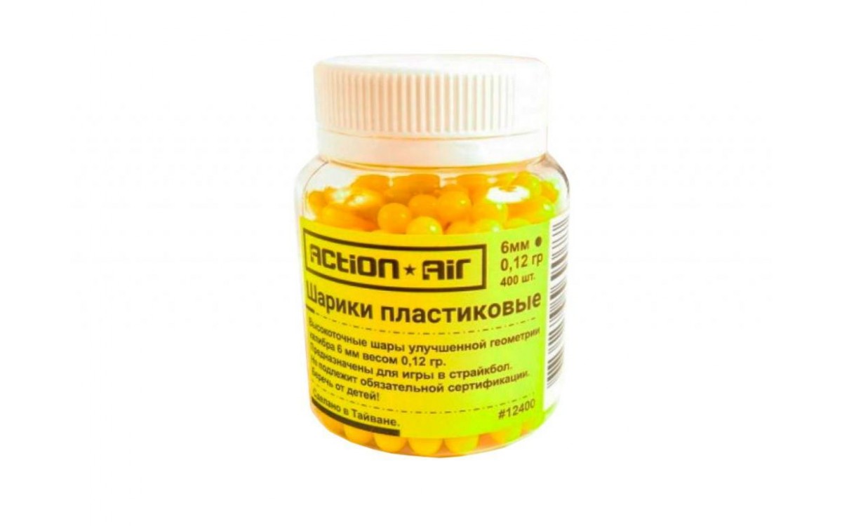 Шарики пластиковые 6 мм Action Air 0,12 гр (400 шт) - высокоточные шары улучшенной геометрии калибра 6 мм весом 0,12 гр желтого цвета. Шарики используются для игры в страйкбол.