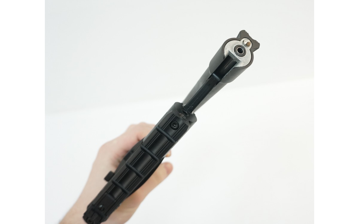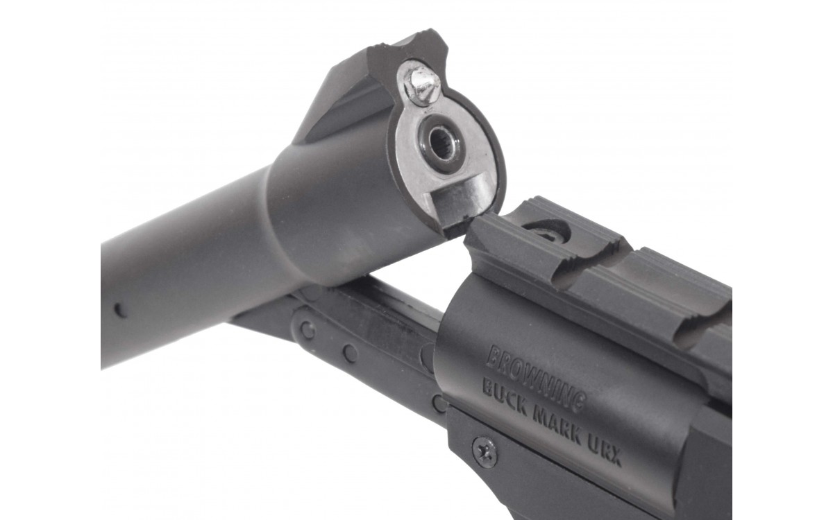 Пистолет Umarex Browning Buckmark URX выполнен по классической схеме перелома ствола вниз. При повороте ствольной муфты тяга толкает поршень в заднюю часть компрессора, где он фиксируется шепталом. При нажатии на спусковой крючок подпружиненный поршень создает воздушную струю, которая и способствует выталкивании пули.
