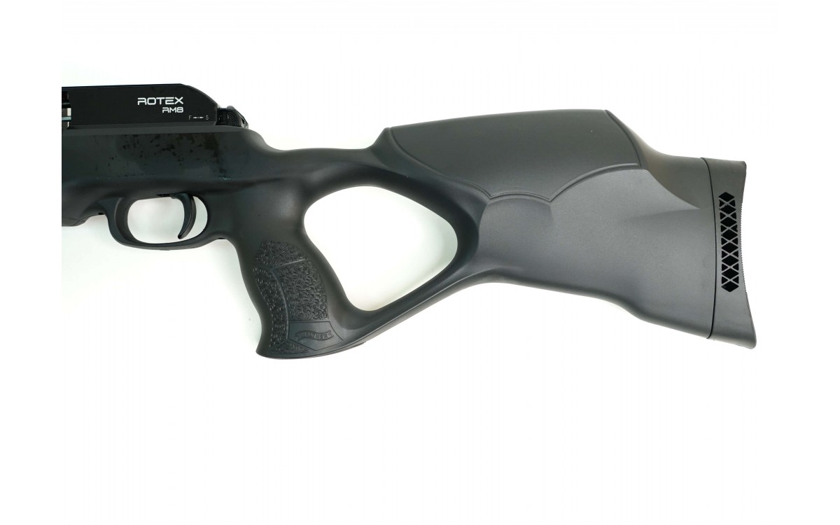 В пневматической винтовке Umarex Walther Rotex RM8 Varmint калибра 5,5 мм сжатый воздух под высоким давлением (до 250 бар) подается в резервуар. Сжатый воздух подается через заправочное отверстие на цевье пневматического устройства. Предварительно воздух нагнетается в ресивер объемом 215 см3 с помощью насоса или ВД компрессора.