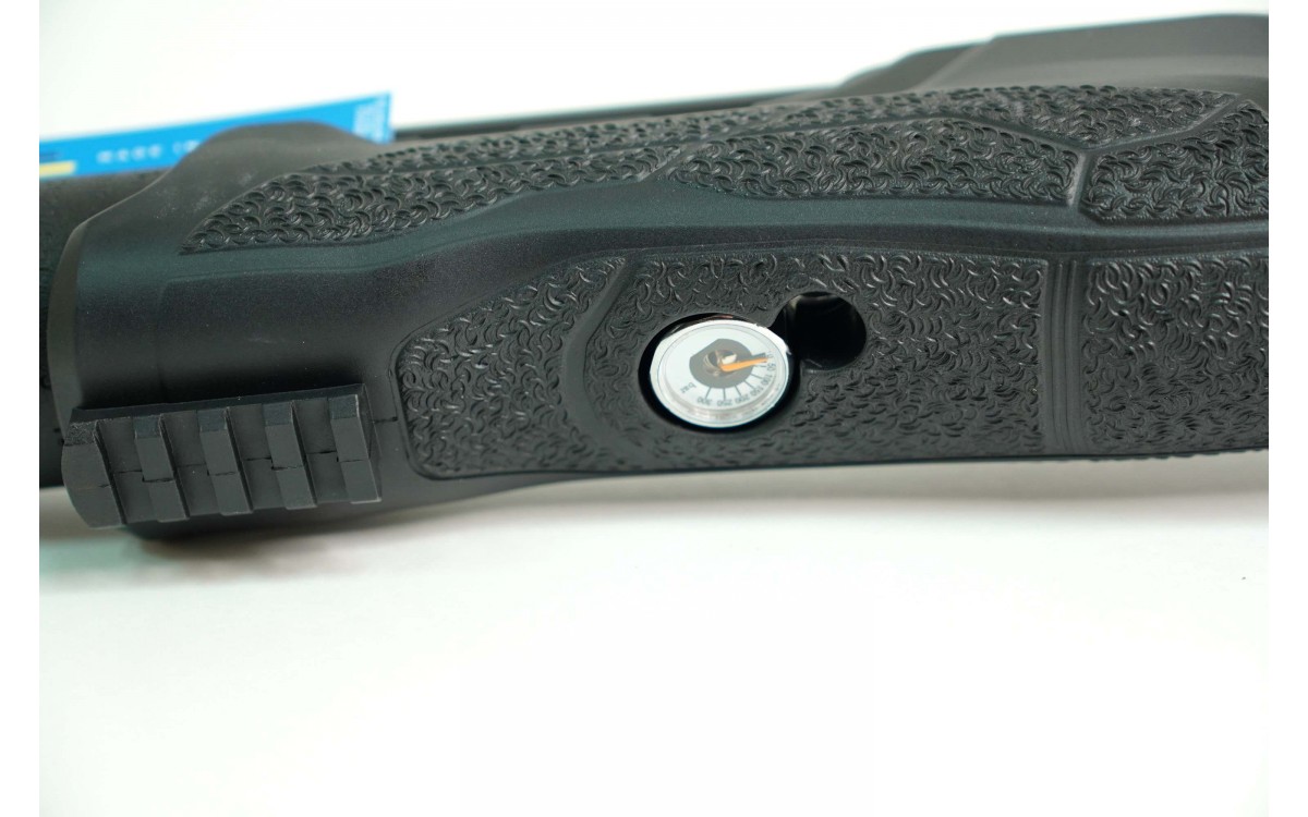 Давление в клапане контролируется манометром в заправочном отверстии цевье. За одну заправку можно произвести в среднем 40-60 выстрелов.